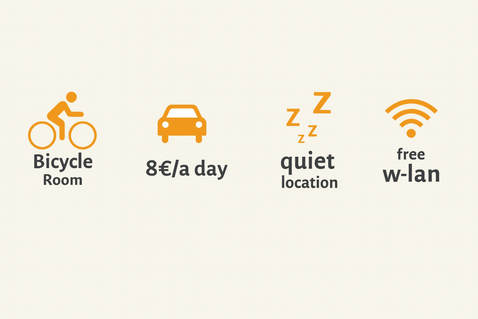 Shower in single and double rooms or bathtub in triple, four-bed and family rooms, toilet, hairdryer, kettle, cable TV, parquet floor, direct dial telephone and a minibar. You can also get a coffee machine (capsule machine) as well as an ironing board and iron on request.